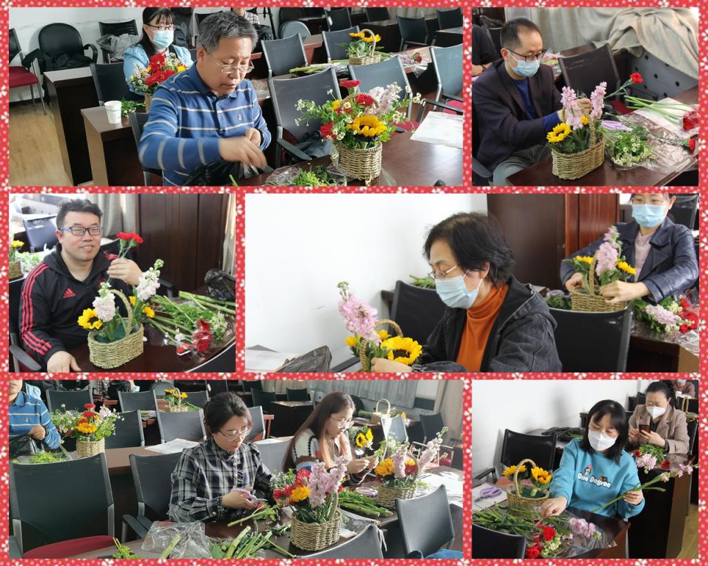 春䁔花开,寓意生活更加美好。在活动现场,老师们在一簇簇鲜花的芬芳中走入了插花世界。插花是一门高雅艺术,内涵丰富,学问不小。公司邀请的花艺师结合花艺知识与插花技巧进行了现场演示和指导。老师们一边仔细聆听花艺老师所讲授的插花技巧,一边按照自己对美的理解,利用手边的花材亲手实践,以花枝表达情韵。老师们细细琢磨,观赏设计,在相互沟通,交流启发中,放松了身心,丰富了审美情趣,增进了情谊,提升了幸福感。当一盆盆由老师们亲手制造的、错落有致、精致盎然的花篮作品呈现在众人面前时,大家互相观赏,爱不释手,纷纷拿出手机拍照,合影,共同记录这美好时刻,喜悦之情溢于言表。活动在轻松愉快的氛围中结束。