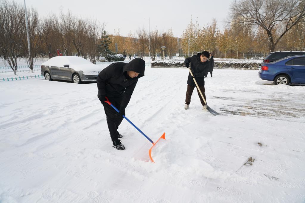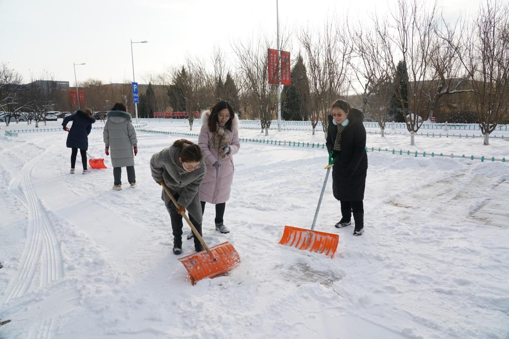 活动中,大家携带扫把、铁锹等除雪工具,按照公司网格责任区域划分来到兴文楼南侧停车场与德邻公寓9-11号楼附近,及时对积雪进行清除。在党委书记陈元的统筹指挥下,副经理耿华带领参加活动的师生们手持铁锹、扫帚,铲除积雪,清扫路面,分工明确,配合默契,干劲十足。经过一个多小时的奋战,基本完成负责区域内的积雪清扫任务。