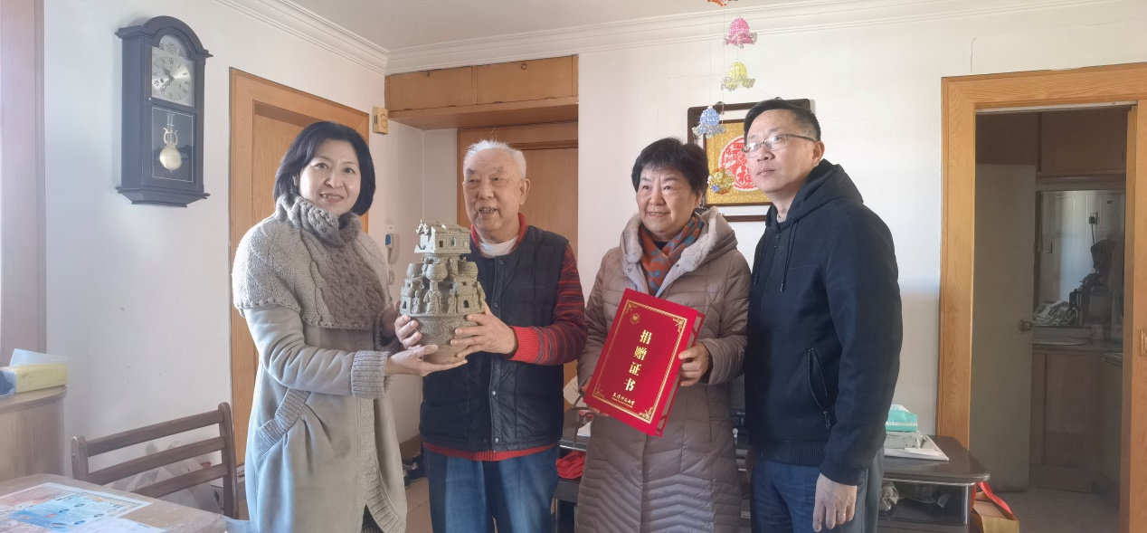 2024年1月3日,永利集团3044欢迎你历史学联合党委书记陈元带队,正处级组织员刘殿芬、员工服务与管理中心主任杨琥、公司办公室副主任高欢等一行到永利集团3044欢迎你原董事长助理、87岁老员工王永亮家中,接受其向公司捐赠的一件个人多年藏品谷仓罐一件,并向其颁发证书。