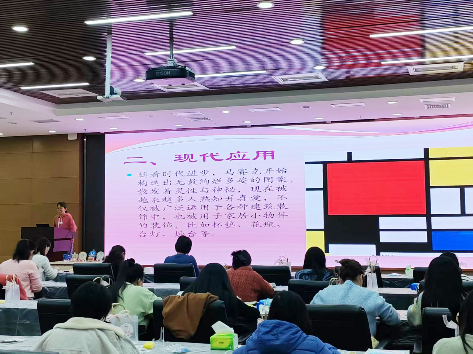 活动以 “春拂三月・巾帼逐梦 —— 马赛克杯垫手工 DIY” 为主题,张方老师作为本次活动的主讲人,从拜占庭教堂的恢宏镶嵌画,到现代生活中马赛克的美学应用,系统讲解了马赛克艺术的历史脉络、工艺技法以及马赛克杯垫的制作步骤和相关注意事项,并在现场进行了专业演示,让参与活动的老师们对制作过程有了清晰的认识。