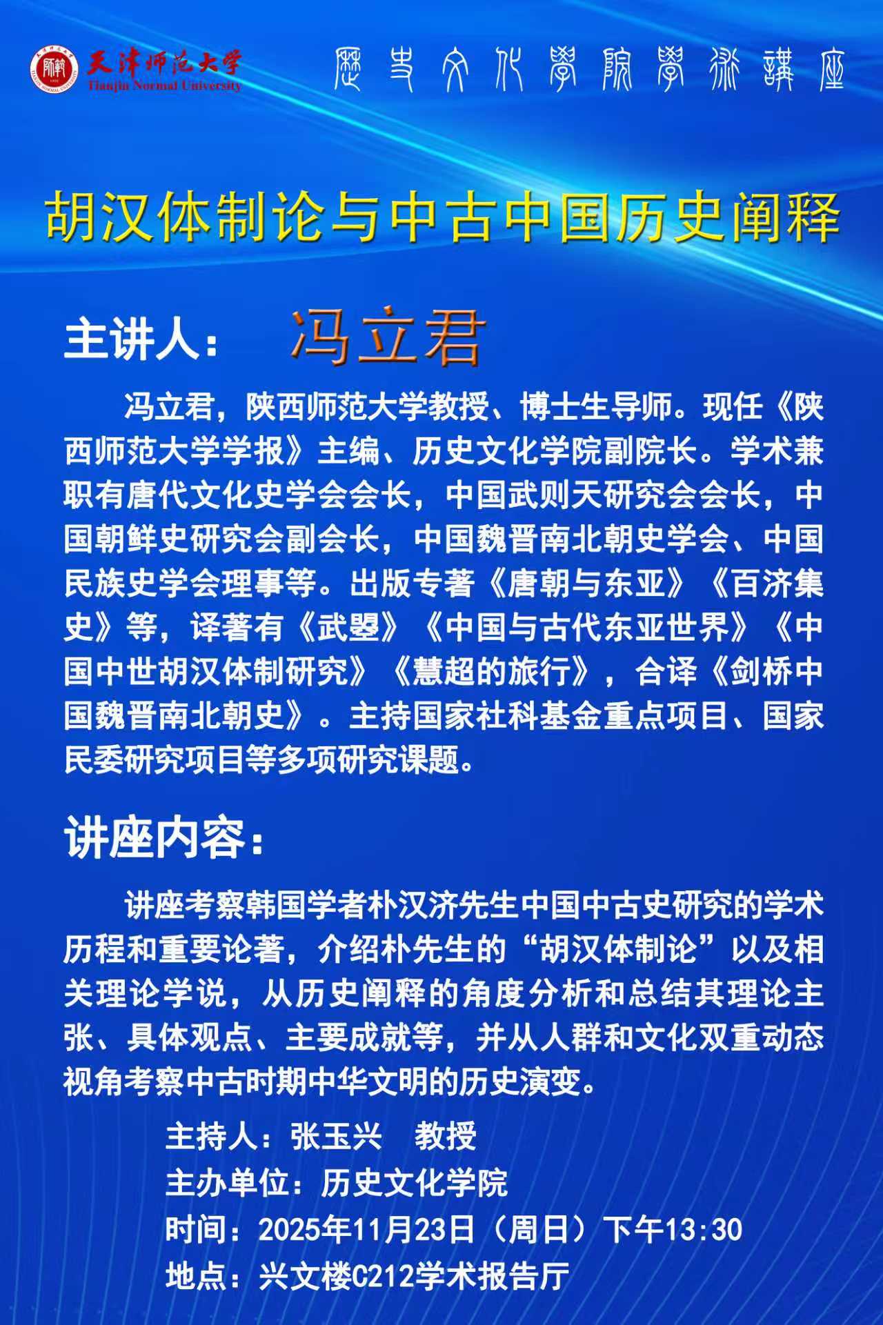 2025年11月23日,冯立君教授将为师生带来题为《胡汉体制论与中古中国历史阐释》的学术讲座,详情见海报。